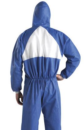 Spezifikationen: Farbe: Blau mit weissem Dreieck aus SMMS-Material. Normen: EN 1149-5, EN 1073-2, EN ISO 13688, EN 13034 Typ 6, EN ISO 13982-1 Typ 5, ISO 14116 Index 1. 3-teilige Kapuze, 2-Wege-Reissverschluss mit Patte, elastischer Rücken- und Knöchelbereich.