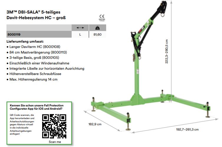 Eigenschaften: Das 3M DBI-SALA Davit-System 8000119 ist ein modulares, leichtes und dennoch robustes System aus hochfestem Aluminium. Es wurde für den sicheren Ein- und Ausstieg sowie die Rettung aus beengten Räumen wie Mannlöchern entwickelt. Der drehbare Mast ist höhen- und reichweitenverstellbar und verfügt über integrierte primäre und sekundäre Anschlagpunkte. Mit seiner modularen Bauweise lässt sich das System leicht transportieren, aufbauen und an verschiedene Einsatzorte anpassen.