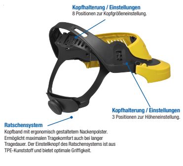 Eigenschaften: Die hohe Qualität, die vielseitigen Kombinationsmöglichkeiten und das komfortable Ratschensystem machen die Kopfhalterung G500 zum perfekten Begleiter, wenn Gesicht und Ohren geschützt werden müssen, jedoch kein Schutzhelm benötigt wird.