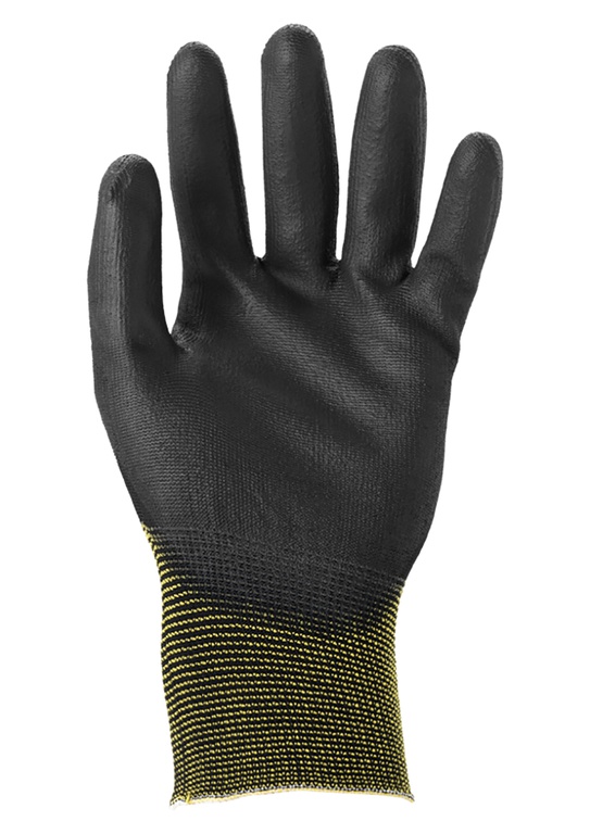 Spezifikationen: EN 388: 4131A. Farbe: Schwarz. Latexhaltig. Beschichtungsmaterial: Polyurethan.