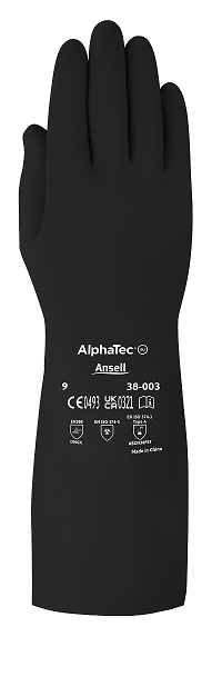 Eigenschaften: ie AlphaTec 38-003 Handschuhe bieten einen hervorragenden Schutz vor aggressiven Chemikalien, einschliesslich Aldehyden, Ketonen, Lösungsmittelestern und konzentrierten Mineralsäuren. Sie bestehen aus einer ultraweichen Butylformulierung auf Wasserbasis, die maximalen Tragekomfort, hohe Flexibilität und Fingerfertigkeit gewährleistet. Das ergonomische Design erleichtert das An- und Ausziehen und schützt Hände und Unterarme zuverlässig. Das erhöhte Rautenmuster sorgt für sicheren Griff bei Nässe oder Trockenheit.