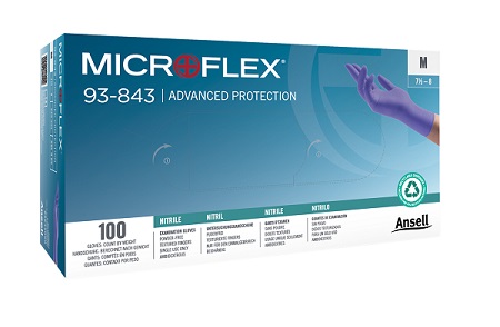 Eigenschaften: Der MICROFLEX 93-843 besteht aus strapazierfähigem Nitril und bietet mit einem AQL-Wert von 0,65 einen hohen Barriereschutz. Texturierte Fingerspitzen sorgen für sicheren Grip. Der Handschuh ist puderfrei, latexfrei und antistatisch (EN 1149).