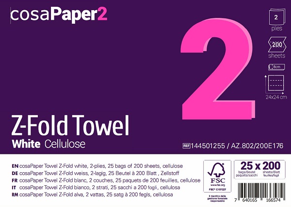 Eigenschaften: Das 2-lagige cosaPaper Z-Falz Handtuch besteht aus hochwertigem Airflex-Material, das eine sehr gute Saugfähigkeit und Stabilität bietet. Es ist weich, reissfest und dank FSC-Zertifizierung umweltfreundlich. Die kompakte Grösse 8x24cm und der Z-Falz sorgen für ein effizientes, sparsames und hygienisches Händetrocknen.