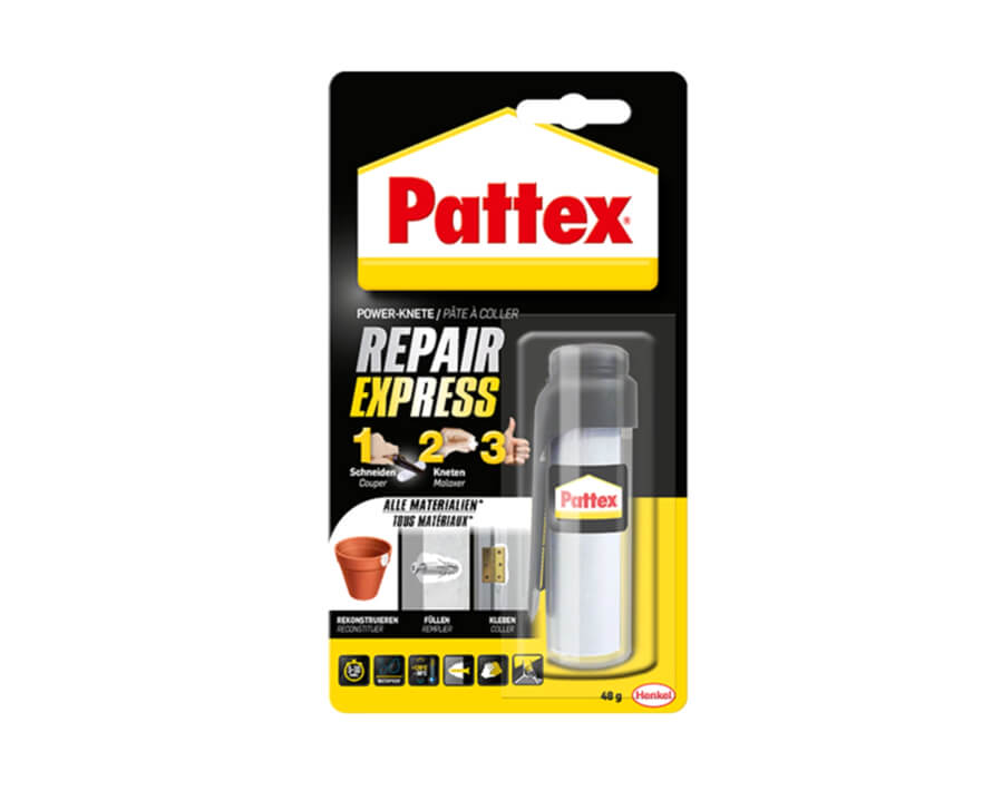 Eigenschaften: Zuverlässige Haftung zum Reparieren, Abdichten, Wiederherstellen oder Füllen mit der zweikomponentigen Pattex Repair Knetmasse.