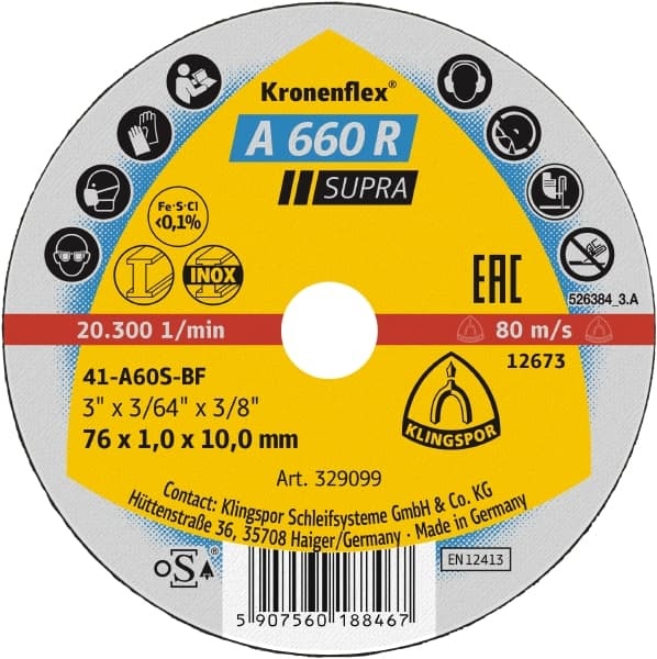 Eigenschaften: Die Kronenflex Kleintrennscheibe A 660 R Supra zeichnet sich durch seine hohe Aggressivität und eine geringe Scheibendicke aus, was zu minimaler Gratbildung führt und wodurch das zeitaufwändige Nachbearbeiten entfällt. Die Trennscheibe ist frei von Eisen, Schwefel und Chlor und kann auf allen handelsüblichen Winkelschleifern verwendet werden.