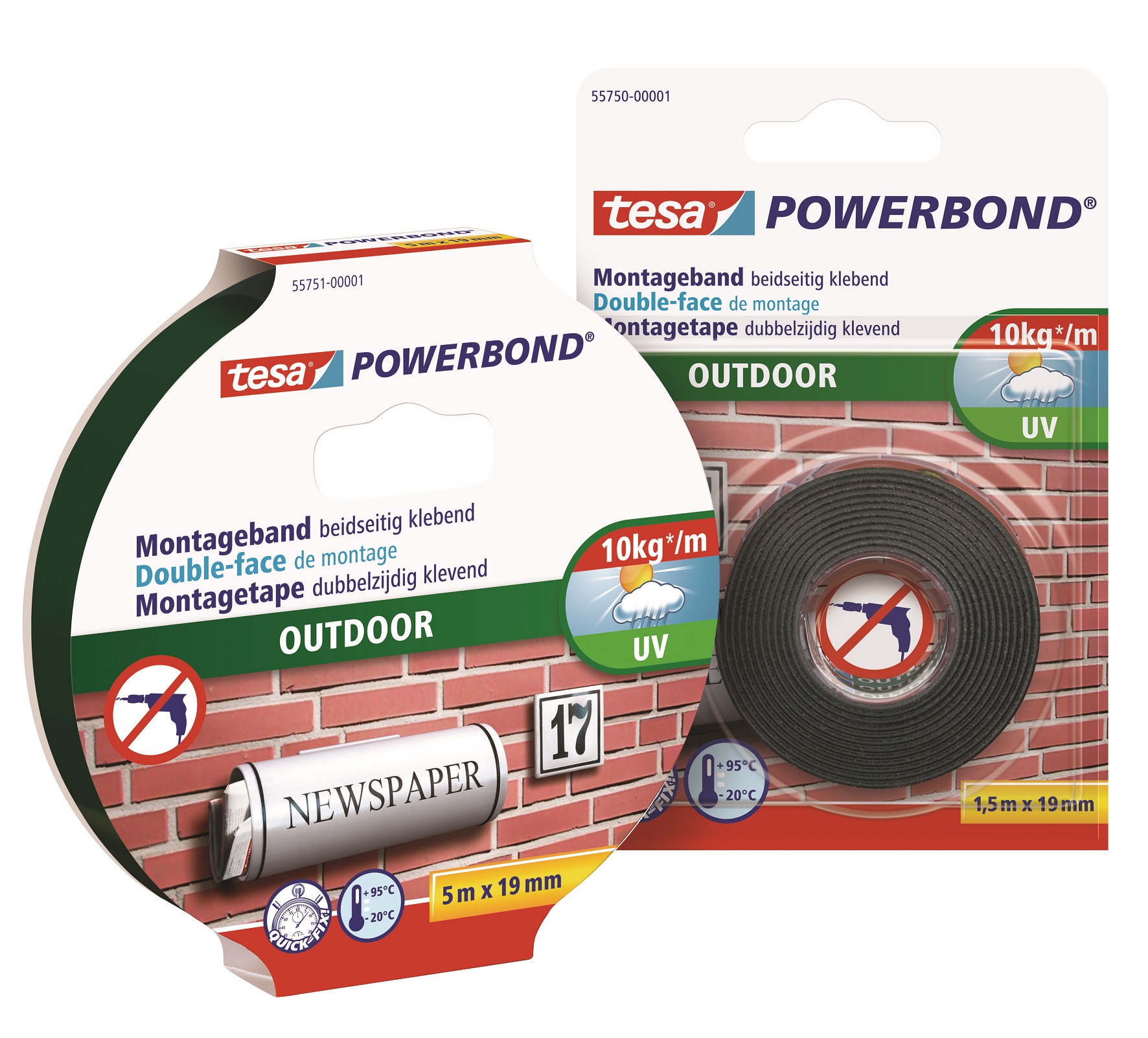 Eigenschaften: tesa™ 5575 Powerbond Outdoor ist stark klebend, doppelseitig, UV-, wasser- und temperaturbeständig und hält bis zu 1kg pro 10cm Montageband.